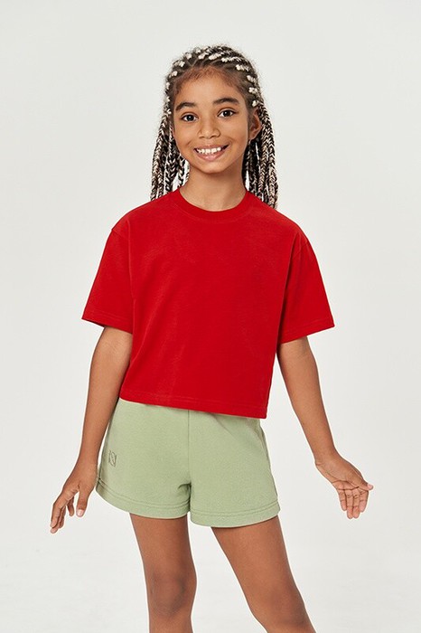 Футболка для девочек укороченная, спущенное плечо, втачной рукав. Горловина из рибаны. Плечевые швы и шов горловины спинки укреплены бейкой из основной ткани.