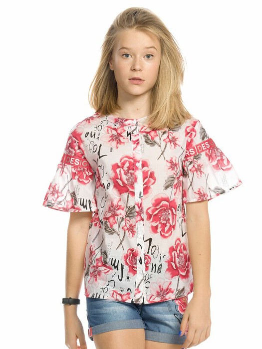 Рубашка для девочек. НОВИНКА! Блузка из тонкого хлопка с центральной застежкой на 6 пуговиц. Силуэт прямой, свободный. Плавная покатая линия плеча переходит в рукав в рукав с притачным широким воланом. По шву притачивания рюши нашита принтованная репсовая тесьма, перевод "Цветы/дизайн". Мягкий принт по всей поверхности изделия. Удобная, комфортная, легкая, дышащая блузка!