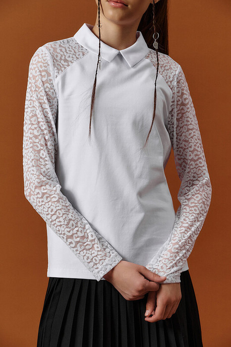 Ищете стильную и удобную блузку для школы, которая сочетает в себе комфорт и элегантность? Эта модель из мягкого эластичного хлопкового трикотажа — отличный выбор для вашей девочки. Наклонные кружевные вставки на плечах и длинные облегающие рукава из нежного эластичного кружева придают блузке изящный и современный вид, при этом кружево мягкое и не раздражает кожу, поэтому ребёнку будет удобно в блузке целый день