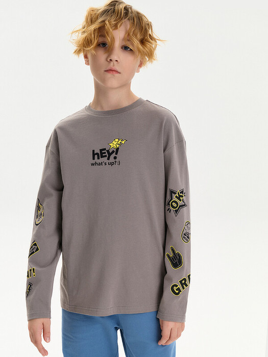 Лонгслив для мальчика умеренного объема. Чуть укорочена сдлина в сравнении с Осень 25. Горловина обработана эластичной рибаной - голова не застрянет. Лонгслив украшен молодежным принтом, перевод надписей: Эй! Как дела?; Ok; Вау; Правильный путь; Отлично! Принт эластичный и прочный, без проблем переносит частые стирки.