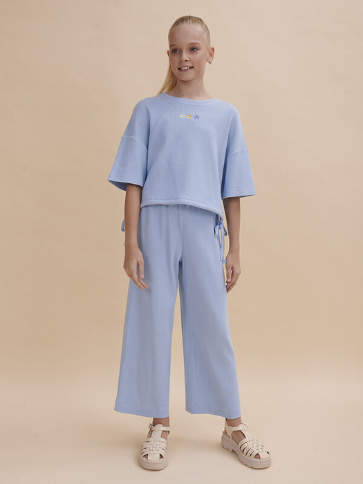 Комплект для девочки (кроп-топ и кюлоты), в котором собраны все самые актуальные тренды. Кроп-топ оверсайз-силуэта с сильно спущенным плечом дополнен утяжками по низу, с помощью которых можно регулировать объём и менять силуэт изделия. Брюки на широкой резинке с внутренней регулировкой объема шнуром. Благодаря особенностям кроя костюм долго будет "расти" вместе с ребенком. Комплект выполнен из трикотажного полотна с модной "вафельной" текстурой. В составе ткани преобладает хлопок, поэтому модель комфортная, приятная на ощупь, в ней не будет жарко летом. Эластан в составе ткани помогает изделию сохранять форму. Ткань проста в уходе. Изюминка топа — лаконичная вышивка в виде трёх цветков. Комплект идеально сядет на девочку любой фигуры, можно покупать без примерки. Костюм для настоящих модниц, в нем каждая девочка будет выглядеть стильно и эффектно.