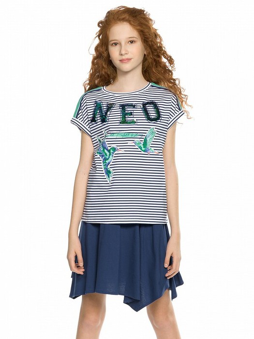 Комплект для девочек футболка и юбка. Футболка свободного объёма с цельнокроеным рукавом с отгибающейся закрепленной манжетой. Вдоль линии плеч настрочена декоративная трикотажная тесьма.  По переду изделия принт с разноцветным глиттером в виде птичек колибри  и надписи, перевод  Блестящее будущее , и вышивка из переливающихся переворачивающихся пайеток. Юбка Новинка. Прямоугольная юбка с фигурной угловатой линией низа, пояс на широкой внутренней резинке.