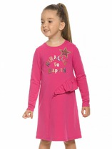 Платье для девочек.Новинка. Платье из трикотажа А-образного силуэта с открытыми плечами и рукавами воланами. По всей линии груди проходит декоративная трикотажная лента, которая спереди формирует угол. Принт в виде птички колибри и надписи с разноцветным глиттером, перевод Новая атмосфера . Платье имитирует многослойность полосатый топ и сарафан.