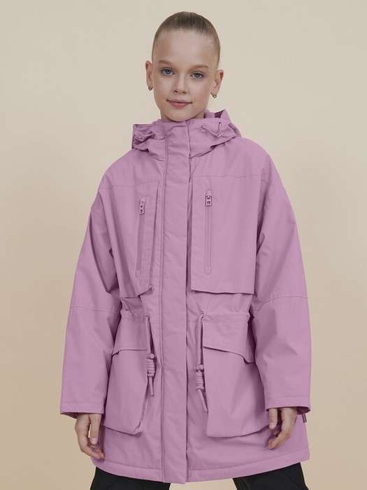 Парка для девочки с температурным режимом не ниже +5°С прямого свободного силуэта. Мягкий оверсайз. Ветровка на флисовом подкладе (верх переда и спинки, подклад капюшона из флиса, а нижняя часть переда и спинки и подкладка рукава из 100% POLY + синтепон 40г/м2 ). Мембранная ткань хорошо защищает нижние слои одежды от намокания. Структура мембранной ткани позволяет коже дышать - ребенок легко двигается и не переохлаждается. Изделие сохраняет первоначальный внешний вид даже при активной носке. Водоотталкивающая пропитка или  DWR (Durable Water Repellent) – «устойчивое водоотталкивающее покрытие» - защищает от промокания под дождем: материал не утяжеляется под воздействием влаги, позволяя свободно пропускать воздух.  Низ рукава прямой, внутри рукава расположена скрытая манжета из мягкой эластичной ткани.