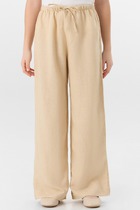 Брюки для девочек прямиго силуэта. Средняя посадка, пояс отрезной с эластичной тесьмой внутри 20RV. В поясе пробиты петли и втянут шнур из основного полотна. Низ обработан швом в подгибку.
