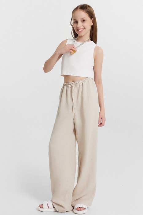 Брюки для девочек прямого силуэта. Средняя посадка, пояс отрезной с эластичной тесьмой внутри 20RV. В поясе пробиты петли и втянут шнур из основного полотна. Низ обработан швом в подгибку.