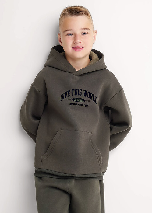 Мягкое тёплое худи из футера с начёсом идально подойдёт для прогулок в прохладную погоду. Модель дополнена уютным капюшоном, накладным карманом и стильным принтом. Худи отлично подойдёт для создания стильного и практичного образа на каждый день!