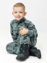 Флисовый комбинезон для мальчика с высоким воротником. Застёгивается на удлинённую молнию с мягкой защитой шеи и подбородка. Рукава и низ изделия на манжетах из  трикотажа в рубчик. Эластичная резинка по спинке обеспечивает идеальную посадку. Спереди удобный карман-кенгуру. Оригинальная набивка выполнена из стойких гипоаллергенных текстильных красителей. Комбинезон сохраняет цвет и форму после многократных стирок.
