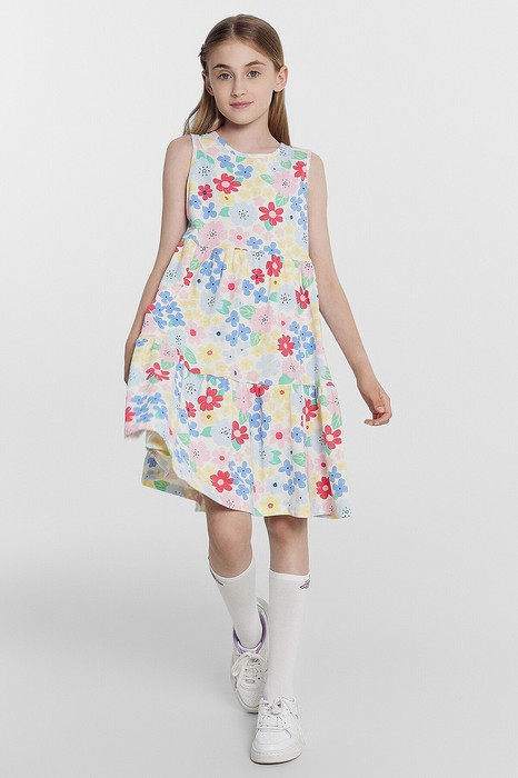 Платье без рукавов, выполненное из легкой трикотажной кулирки. Горловина круглой формы. Нижняя часть платья – с отрезными воланами. Рекомендуем вашей девочке!