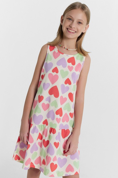 Сарафан для девочек А-силуэта с отрезным воланом по низу. Длина немного выше колена. Горловина круглая. Проймы и горловина окантованы бейкой из основного полотна. Низ изделия обработан швом в подгибку.