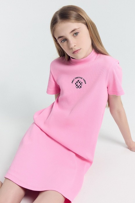 Платье полуприлегающего силуэта. Рукав втачной короткий. Горловина круглая с воротником стойкой. Перед и спинка цельнокроеные. Низ рукавов и изделия обработаны швом в подгибку на 2-х игольной плоскошовной машине.