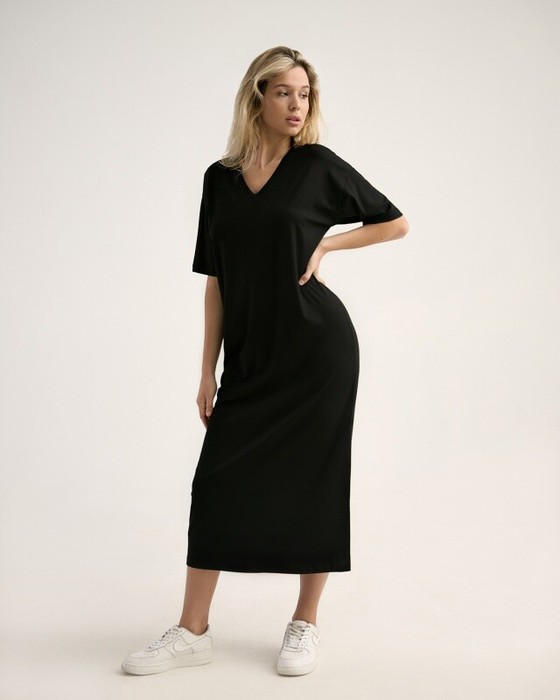 Платье, длина макси с высоким разрезом в левом боковом шве. Спущенное плечо.Втачной короткий рукав. V- вырез.Горловина окантована бейкой из основной ткани.