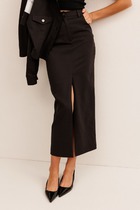 Юбка из трикотажного полотна джинс-трикотаж, А-образного силуэта длиной миди. По талии притачной пояс на внутренней резинке. Спереди средний шов с разрезом. Боковые карманы с отрезным бочком. По спинке средний шов, вытачки. По низу потайная строчка.