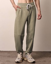 Мужские брюки, джоггеры с резинкой по низу брюк. Пояс из 2-х деталей, внутри резинка. По поясу отстрочка, петли,шнур. Боковые карманы с двойной отстрочкой, боковые швы отстрочены. Задний карман на правой задней половинке брюк.
