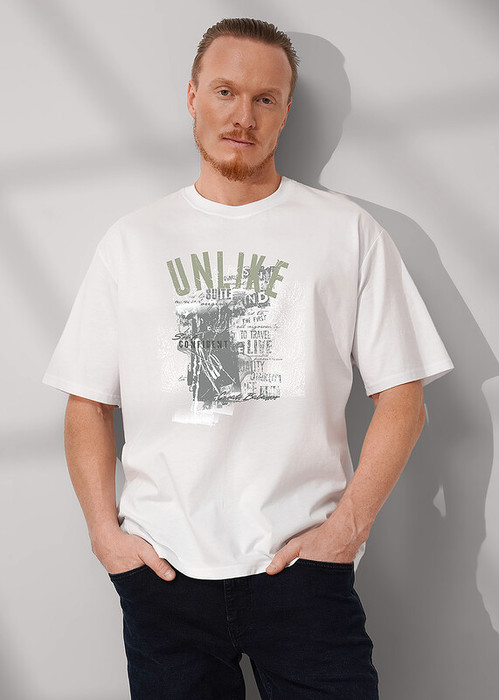 Футболка мужская, увеличенного объема, из хлопкового полотна, круглым вырезом горловины и втачным рукавом. Оригинальность изделию придает дизайнерский принт. Отличный вариант на каждый день.