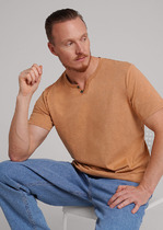 Базовая однотонная футболка стандартного объема с круглой горловиной, втачным рукавом из хлопкового полотна с добавлением эластана. Является неотъемлемой частью мужского гардероба.