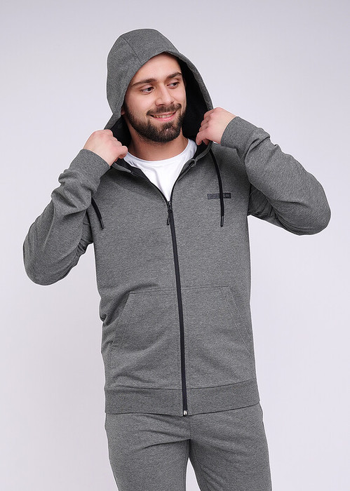 Модная куртка с капюшоном на молнии из плотного трикотажного полотна будет незаменимой вещью в гардеробе любого мужчины, благодаря функциональным карманам "кенгуру" и стильной отделке в виде нашивок.