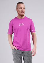 Фуфайка с коротким рукавом среднего объема, круглым вырезом горловины, которая оформлена обтачкой из рибаны, выполненная из набивного полотна.