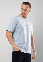 Фуфайка с коротким рукавом среднего объема, с оригинальным принтом, круглым вырезом горловины, которая оформлена обтачкой из рибаны.