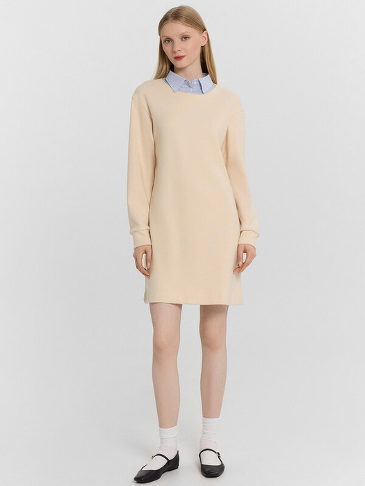 Платье женское прямого силуэта из трикотажного полотна селаник. Горловина круглой формы, с притачным воротником с отрезной стойкой из поплина и застежкой на пуговицу. Плечо слегка спущено, пройма углублена. Рукав втачной, длинный, по низу с отрезной манжетой из селаника. Платье длиной чуть выше колена.