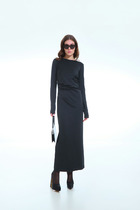 Платье женское прилегающего силуэта из рибаны. Длина миди. Рукава втачные, длинные. Горловина округлая, обработана обтачкой из основного полотна. По переду и спинке декоративные лампасы из кулирного полотна. Низ изделия и рукава обработаны швом вподгибку.