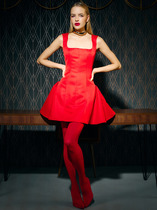 Красное нарядное платье с вырезом каре создает образ уверенной женственности. Модель мини-длины с изящными драпировками по боковым швам юбки мягко подчеркивает фигуру, подчеркивая изящество линий.