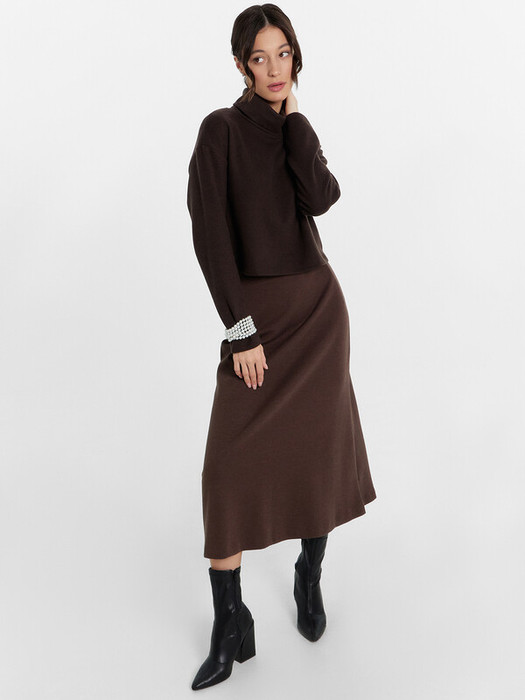 Юбка А-силуэта, длиной миди. Верхний срез обработан швом вподгбку с эластичной тесьмой (внутренняя). На задней детали застрочены вытачки. Нижний срез обработан швом вподгибку.