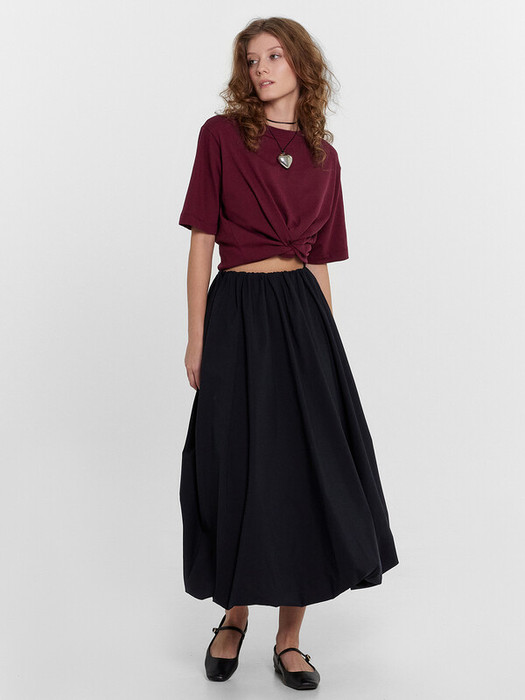 Юбка изготовлена из ткани. Юбка формы баллон на подкладке, длиной миди. По верхнему срезу юбка присборена на эластичную  тесьму жаккард. По нижнему срезу сборка.