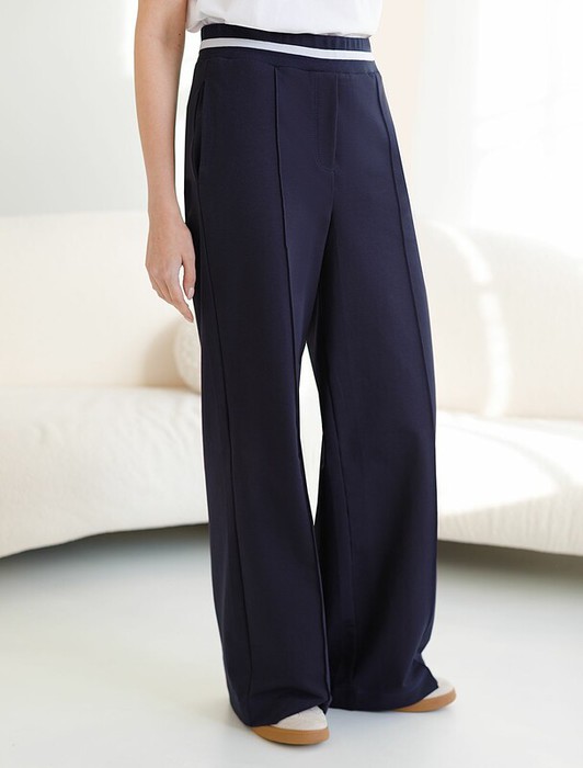 Брюки темно-синего цвета с удобным эластичным поясом на резинке и карманами по бокам выполнены из премиального футера-двухнитки плотностью 240 Г/м2. Наличие эластана в составе гарантирует комфорт и долговечность изделия, материал хорошо пропускает воздух, позволяя телу дышать. Свободный прямой крой обеспечивает свободу движений и максимальное удобство в любых ситуациях, поэтому они подойдут и на большие размеры, а так же на высокий или низкий рост. Фигура подчеркивается, а силуэт визуально вытягивается за счет кроя палаццо и застроченных декоративных стрелок. В повседневных трикотажных брюках вы будете чувствовать себя комфортно и уверенно, наслаждаясь каждым моментом дня. Спортивные брюки подходят для демисезонного использования, в летний период, для занятий спортом в помещении и на улице, а также как часть стиля casual.
