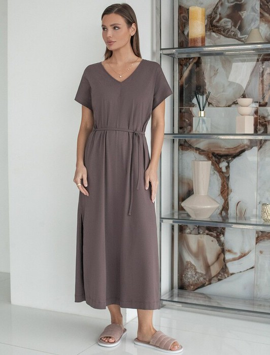 Длинное платье темно-синего цвета с V-вырезом из премиального 100% хлопка плотностью 140 Г/м2 сочетает в себе легкость и благородный стиль. Главная особенность этого изделия — тонкое кулирное полотно, которое легче и воздушнее стандартного трикотажа. Благодаря своей деликатной текстуре модель идеально подходит для домашних образов и пижамных комплектов. Ткань отлично «дышит», обеспечивая максимальный уют во время сна и отдыха. Женственный образ подчеркивает красивое декольте и тонкий пояс, который позволяет регулировать посадку по талии и создает А- силуэт. Модель украшена элегантным высоким разрезом сбоку, добавляющим свободы движению и нежности силуэту. Дышащий материал отлично подходит для теплой весны и лета, не теряет вида после длительного ношения, обеспечивая комфорт даже в жаркую погоду. Короткий цельнкроеный рукав добавляет свежести и удобства, делая платье универсальным для разных сезонов и случаев. Представленная широкая размерная линейка позволяет выбрать подходящий вариант для любой фигуры, в том