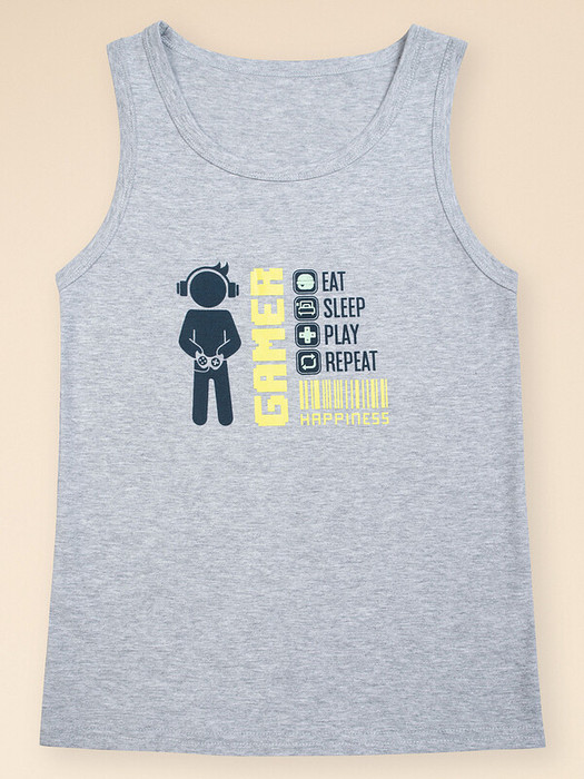 Если вы в поисках качественного, комфортного и стильного белья для своего ребёнка, обратите внимание на нашу майку из 100% хлопка для мальчика. Натуральный состав ткани обеспечивает изделию мягкость и воздухопроницаемость — кожа ребёнка дышит. Модель комфортно сидит по фигуре, её можно надевать под рубашку, джемпер, свитер. Горловина и проймы изделия обработаны в тон изделия — они хорошо держат форму, мягкие, надолго сохраняют аккуратный внешний вид. Майка представлена в актуальном оттенке "серый меланж". Практичный и универсальный, он великолепно сочетается с любой одеждой. Модель украшает забавный принт геймерской тематики — понравится любому мальчишке! Перевод: "есть, спать, играть, повторять. Счастье". Принт эластичный и прочный — отлично переносит частые стирки. Такая майка идеальна для повседневной носки, а также для отдыха. Станет замечательным подарком, который способен вызвать искреннюю радость у каждого ребёнка, оставив незабываемые воспоминания о любом празднике и принося массу удовольствия каждый