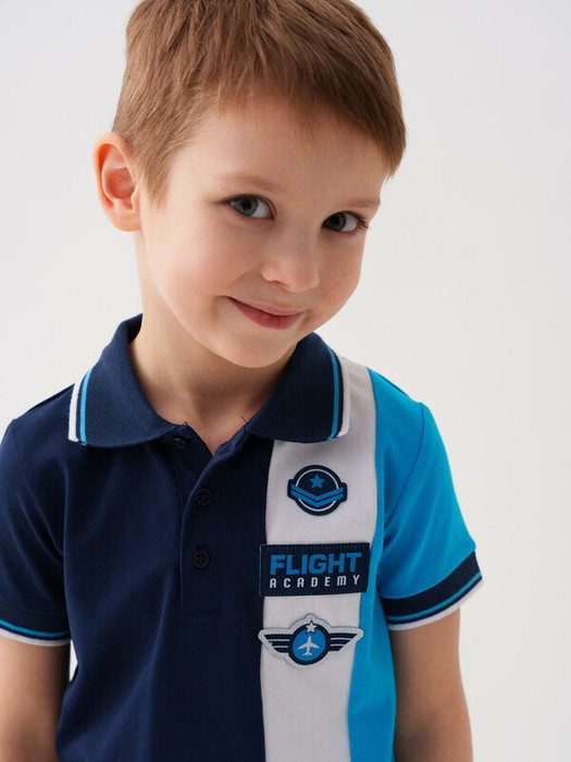 Детская футболка-поло для мальчика. Модель прямого кроя, с короткими рукавами. Основной материал — мягкий и эластичный хлопковый трикотаж джерси. Воротник и манжеты — из рельефной ткани. Спереди — декоративные патчи в авиационной тематике и планка с пуговицами. На рукаве — яркий принт.