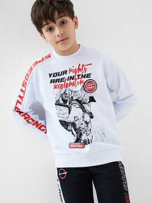 Свитшот оверсайз для мальчика подростка. Выполнено из хлопкового футера без начеса. На груди и рукаве — крупный принт, вдохновлённый мотоспортом. Манжеты и низ изделия выполнены из эластичного риба, что обеспечивает комфортную посадку.
