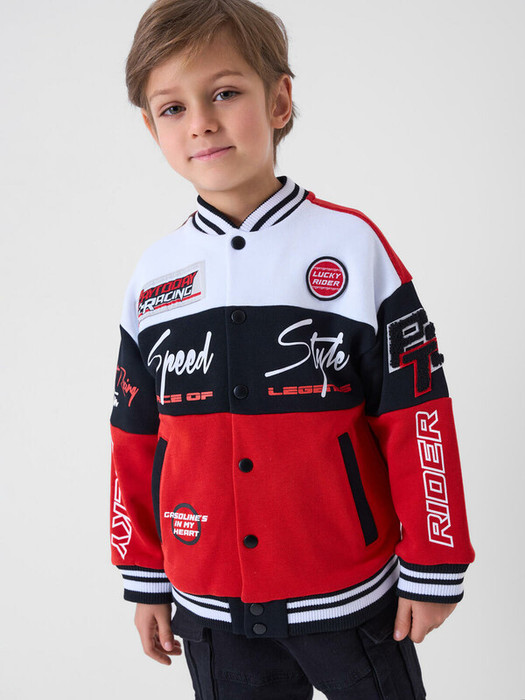 Бомбер детский оверсайз для мальчика. Выполнен из хлопкового футера без начеса. Застежка на кнопки. На передней части и рукавах — выразительные принты и нашивки в гоночной тематике. Спереди два кармана. Низ изделия и рукава оформлены эластичными резинками. Можно составить family look cо взрослым вариантом аналогичного дизайна.