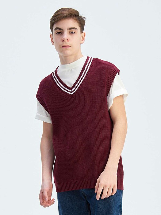 Стильный вязанный жилет унисекс с V-образным вырезом из хлопковой пряжи прямого фасона. Боковые швы дополнены разрезами. Низ жилета, пройма рукавов и вырез горловины оформлены фактурной резинкой, вдоль горловины резинка контрастного цвета. Жилет выполнен из 100% хлопка, что обеспечивает отличную воздухопроницаемость и комфорт в повседневной носке.