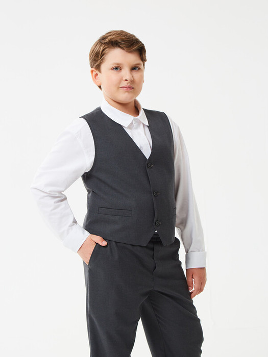 Жилет из смесовой вискозы на вискозной подкладке для мальчика с V-образным вырезом и боковыми прорезными карманами с листочкой . Спинка дополнена хлястиком с металлической пряжкой для регулировки жилета по полноте. Застегивается на три пуговицы.
