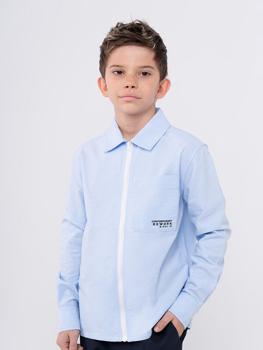 Сорочка для мальчика из смесового хлопка полуприлегающего силуэта. На спинке - кокетка. Воротник отложной со стойкой. Левая сторона полочки дополнена накладным карманом. Карман вверху декорирован принтом. Застёжка по центру переда на молнию. Рукава рубашечные со шлицами и манжетами.