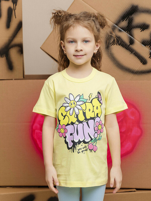 Футболка для девочки с коротким рукавом в желтом цвете с принтом из натурального хлопка. Важный элемент гардероба, особенно в летний период и для повседневного ношения. Базовая футболка на каждый день из 100% хлопка, что обеспечивает комфорт и безопасность для кожи.Характеристики:Ткань: 100% хлопокПроизводитель: batik
