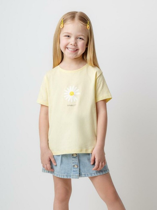 Футболка для девочки из гладкого трикотажа, произведённого из высококачественного натурального хлопка. Оригинальный принт выполнен из стойких текстильных красителей. Изделие сохраняет цвет и форму после многократных стирок.