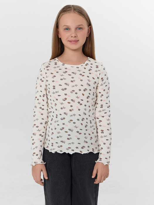 Джемпер для девочек с нежным цветочным принтом — элегантный вариант для школы и праздников. Прилегающий силуэт облегает фигуру, сохраняя свободу движений. Удобный круглый вырез и длинные рукава с фактурной резинкой добавляют модели аккуратный вид.