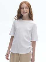 Футболка прямого силуэта для девочек с цельнокроеным рукавом. Нижние срезы рукавов с отворотами. Горловина круглой формы, обтачка из основного полотна. Шов притачивания обтачки закрыт бейкой из основного полотна. Низ изделия обработан на 2-х игольной плоскошовной машине швом в подгибку.