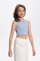 Футболка из модной ткани в рубчик для девочки. Благодаря преобладающим в составе хлопку и вискозе ткань изделия дышит и приятна на ощупь.  Эластан помогает сохранять форму. По бокам модели кулиски с тесьмой — актуальный тренд. С их помощью можно делать стильную сборку с одной или двух сторон. Такая футболка хорошо сочетается с различными шортами, леггинсами, кюлотами или джоггерами.