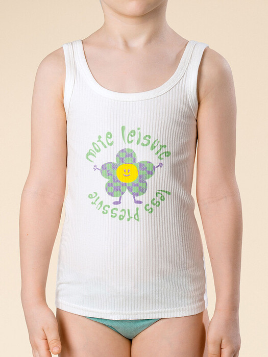 Если вы находитесь в поисках красивого и комфортного белья для своей дочки, обратите внимание на нашу изящную майку из модной ткани в рубчик для девочки. Модель выполнена из кашкорсе с высоким содержанием хлопка — изделие мягкое, воздухопроницаемое, кожа ребёнка дышит. Эластан в составе помогает майке сохранять великолепную форму, даже при частых стирках. Горловина и проймы обработаны эластичным пайпингом в тон — они не растягиваются, остаются в первозданном виде долго. Модель комфортно сидит по фигуре, подходит для носки под блузкой, джемпером, платьем. Изделие представлено в двух цветах. Классический белый вариант универсален, его можно надеть под белую блузку. Интересный бледно-желтый смотрится очень нежно и понравится любой девочке. Майку украшает забавный принт с позитивной надписью. Перевод принта: "Больше досуга, меньше давления". Принт мягкий и стойкий, замечательно переносит стирки. Отличный выбор для повседневной носки, сна, отдыха. Станет замечательным подарком, который способен вызвать искреннюю