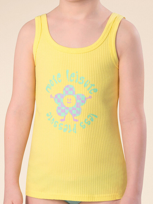 Если вы находитесь в поисках красивого и комфортного белья для своей дочки, обратите внимание на нашу изящную майку из модной ткани в рубчик для девочки. Модель выполнена из кашкорсе с высоким содержанием хлопка — изделие мягкое, воздухопроницаемое, кожа ребёнка дышит. Эластан в составе помогает майке сохранять великолепную форму, даже при частых стирках. Горловина и проймы обработаны эластичным пайпингом в тон — они не растягиваются, остаются в первозданном виде долго. Модель комфортно сидит по фигуре, подходит для носки под блузкой, джемпером, платьем. Изделие представлено в двух цветах. Классический белый вариант универсален, его можно надеть под белую блузку. Интересный бледно-желтый смотрится очень нежно и понравится любой девочке. Майку украшает забавный принт с позитивной надписью. Перевод принта: "Больше досуга, меньше давления".  Принт мягкий и стойкий, замечательно переносит стирки. Отличный выбор для повседневной носки, сна, отдыха. Станет замечательным подарком, который способен вызвать искреннюю