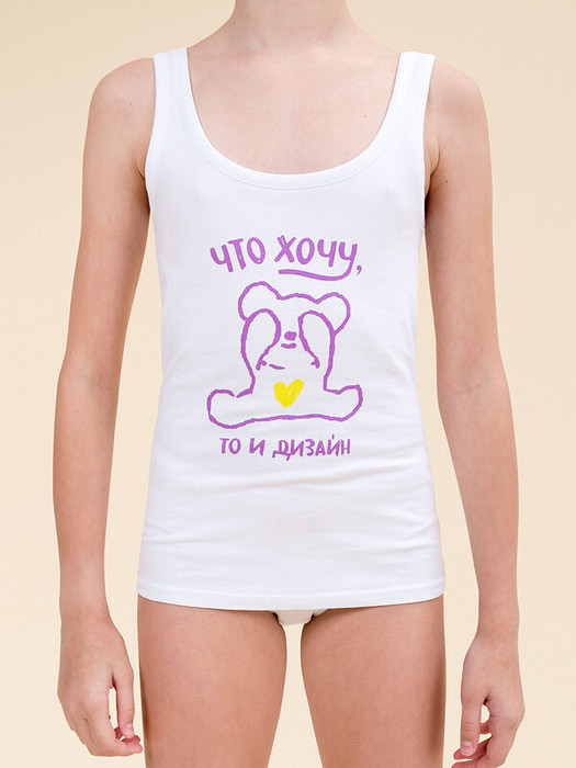 Каждая мама заботится о комфорте своего ребёнка и хочет выбрать для него только действительно качественное бельё. Наша красивая майка для девочки отлично подходит под эти запросы. Майка детская выполнена из ткани с высоким содержанием хлопка — она приятна на ощупь, великолепно пропускает воздух, позволяя коже ребёнка дышать. Эластан помогает изделию сохранять отличную форму в течение длительного времени. Качественная ткань и правильный крой гарантируют идеальную посадку — ребёнок чувствует себя комфортно целый день. Горловина и проймы обработаны эластичным пайпингом в тон — они не растягиваются и надолго сохраняют прекрасный внешний вид. Хлопковая майка представлена в классическом белом цвете — подойдёт под любую одежду. Майка декорирована позитивным принтом в виде милого медвежонка с сердечком и надписи "что хочу, то и дизайн". Принт мягкий и устойчивый, отлично переносит стирки. В линейке представлены майки детские следующих размеров: 1 (86); 2 (92); 3 (98); 4 (104); 5 (110); 6 (116); 7 (122); 8 (128); 9 (134); 10 (140); 11 (146). Нательная майка для девочки — идеальный выбор для повседневной носки под одеждой, а также она подходит для летнего отдыха и в качестве домашней одежды. Изделие можно носить круглый год: летом, весной и осенью (демисезон), зимой. Майка детская для девочек — прекрасный подарок дочери, внучке или сестре на любой праздник. Выбирайте нужный размер по таблице размеров на фото. Цвет товара на экране вашего устройства может отличаться от цвета изделия вживую. Товар возврату и обмену не подлежит.
