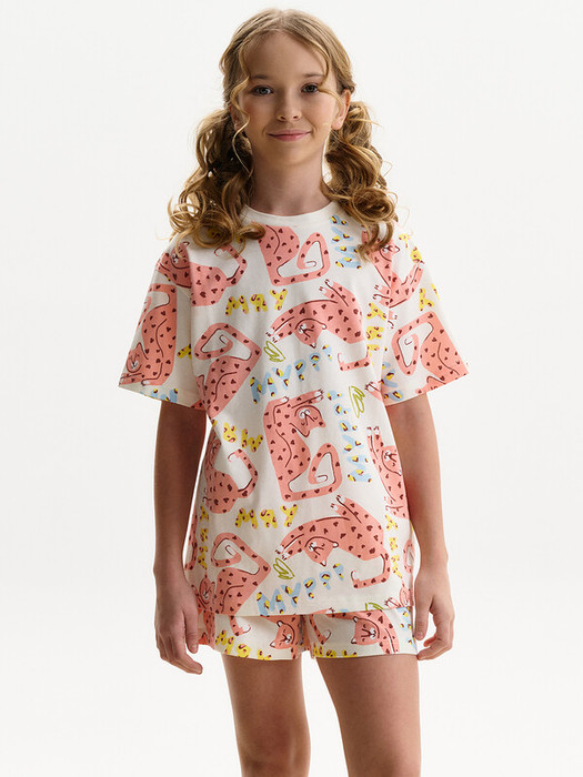 Детский пижамный костюм двойка - это мягкая футболка с коротким рукавом и удобные шорты, выполненные из натуральных материалов. Пижама для девочки изготовлена из 100% хлопка. Свободная футболка с позитивным принтом, плечо немного спущено, рукава широкие. Широкая и мягкая резинка в поясе шортов не перекручивается и не давит. Отделка горловины из эластичной рибаны — она не растягивается, ребёнку удобно надевать и снимать пижаму.