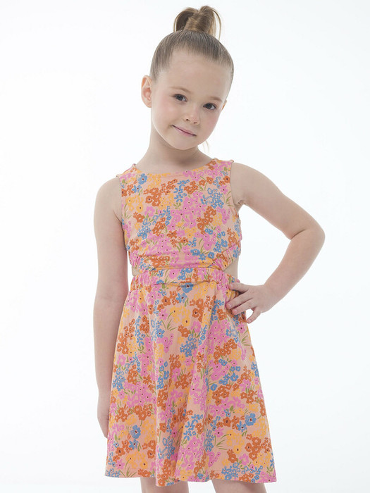 Летнее приталенное платье оригинального кроя для девочки. Имитация комплекта из модного кроп-топа с округлым вырезом горловины и юбки на резинке. Верхняя часть изделия и юбка соединены только по переду, поэтому спинка немного открыта. 100% хлопка в составе ткани — модель приятна на ощупь и очень комфортна для жары. Крой юбки — полусолнце, поэтому она не сковывает движений. Платье декорировано нежным цветочным принтом. Отличный выбор для летнего отдыха и прогулок.