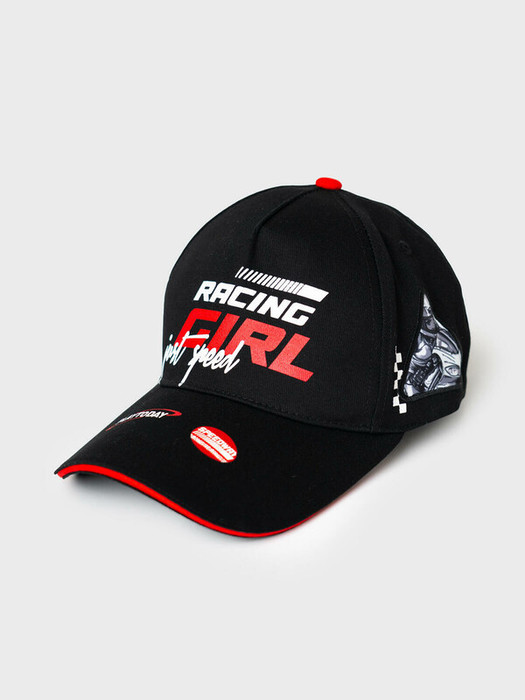Бейсболка для девочки подростка в спортивном стиле. Спереди расположен стильный принт, а по бокам — две нашивки с изображением мотоциклистки. Козырек изогнутый. Размер можно регулировать с помощью пластиковой застежки на кнопки сзади. Люверсы для вентиляции.