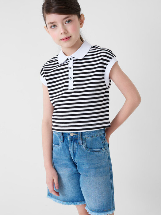 Джинсовые шорты для девочки подростка. Прямая модель средней длины. Застёжка на молнию и болт. Удобная посадка с регулируемым поясом на внутренней резинке. Спереди два классических кармана, сзади — накладные.