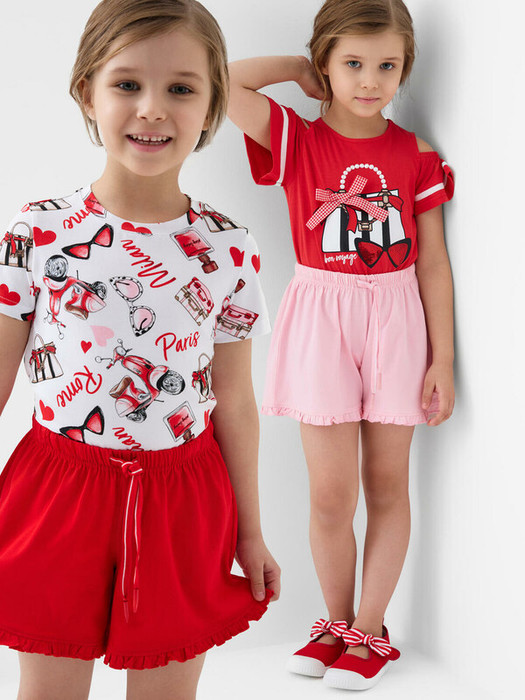 Набор детских шорт для девочки. В комплект входят две пары шорт свободного кроя. Модели из мягкого, хлопкового трикотажа джерси. Удобная посадка обеспечивается эластичным поясом со шнуром с бусинами. По бокам расположены два кармана. Декоративные рюши по низу.